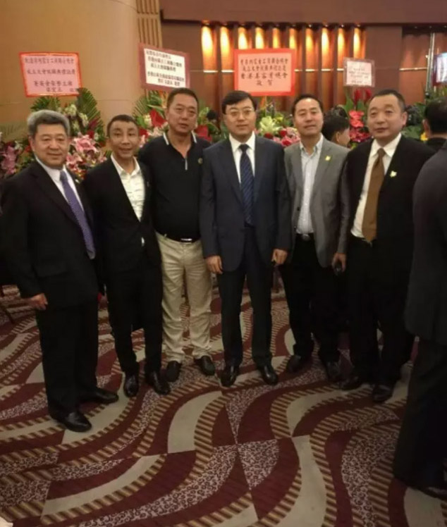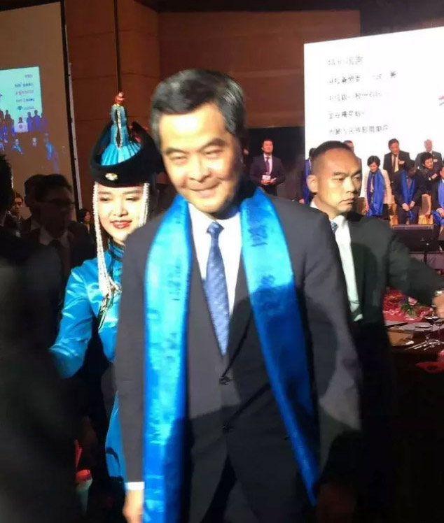 (前排左四為內(nèi)蒙古自治區(qū)主席布小林、左五為香港特首梁振英、左六為香港內(nèi)蒙古工商聯(lián)合總會會長陳建文)